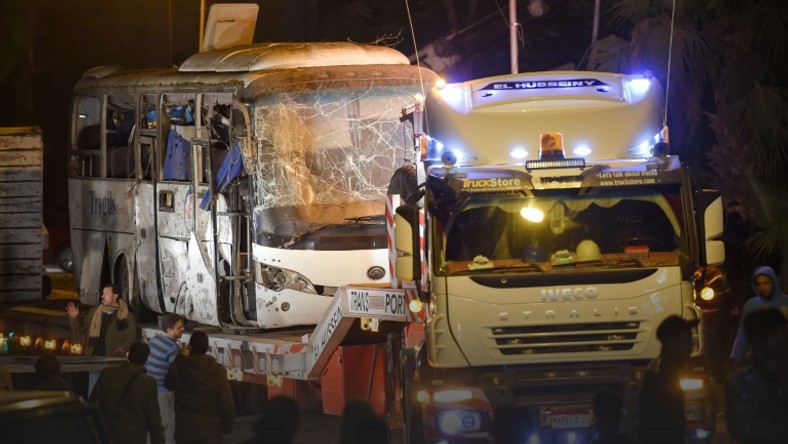 3/4 A member of the Egyptian security forces stands guard at the scene of an attack on a tourist bus in Giza province south of the Egyptian capital Cairo on December 28, 2018