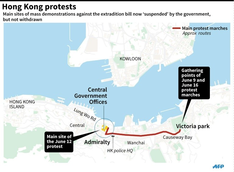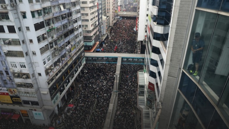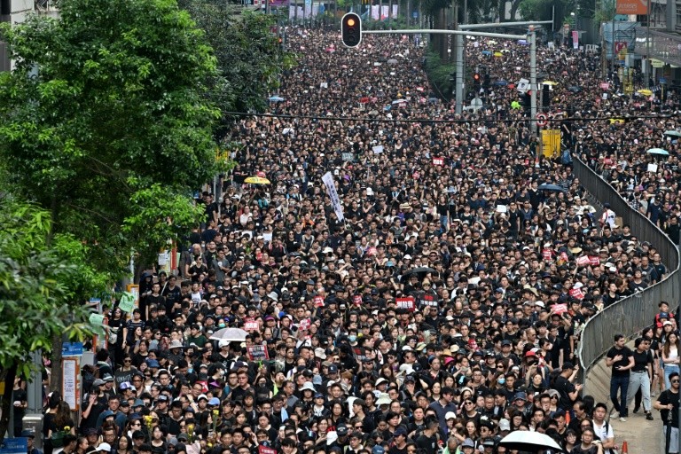 The enormous show of force saw protesters chanting "Scrap the evil law!" as they marched through the streets calling for the resignation of chief executive Carrie Lam, who paused work on the hugely divisive bill Saturday after days of mounting pressure, saying she had misjudged the public mood.